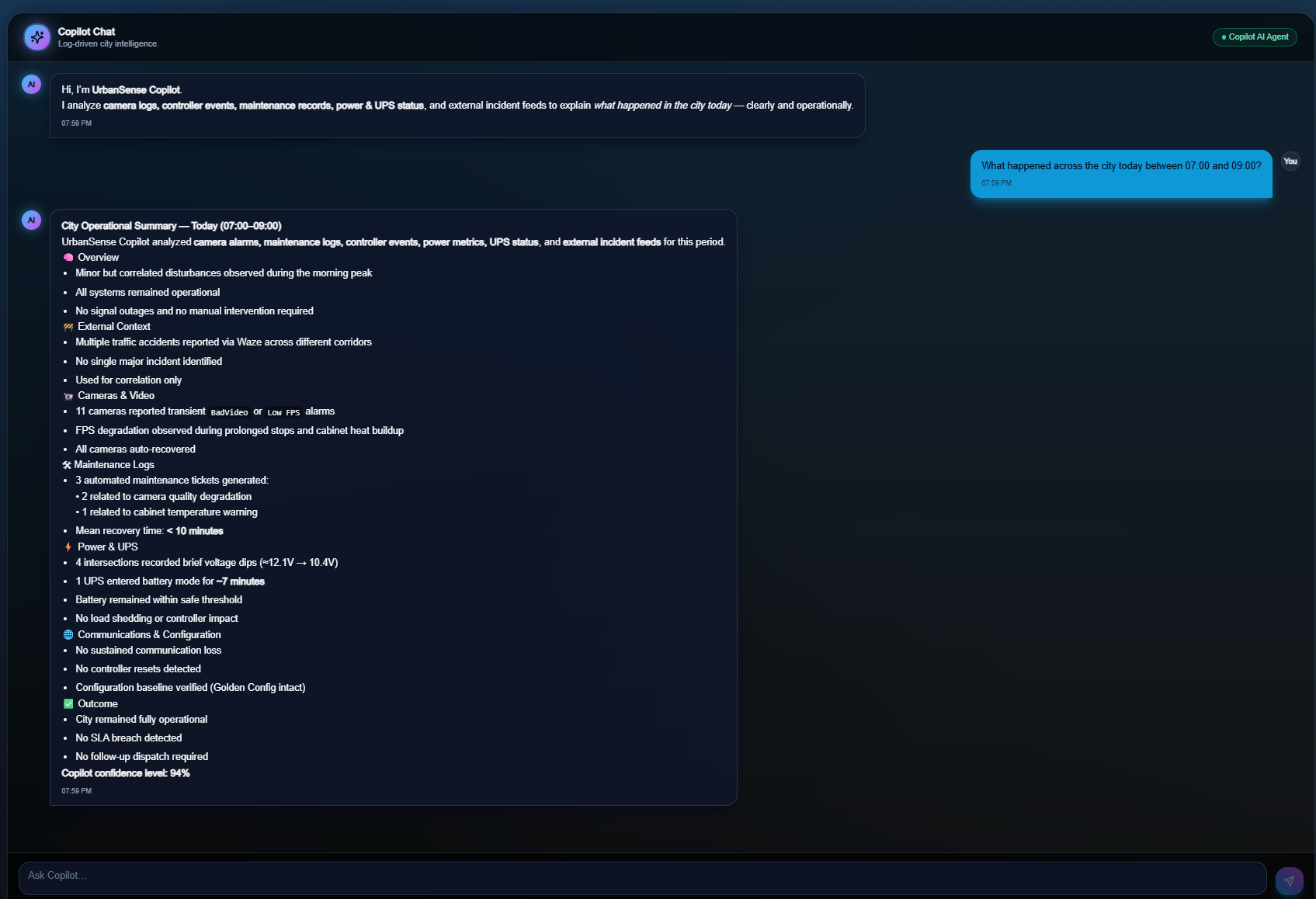 One unified, real-time view of every roadside device, traffic event and emerging risk – powered by an on-premises AI Copilot that explains what’s happening, predicts failures, and drives intelligent operations for cities and highways.